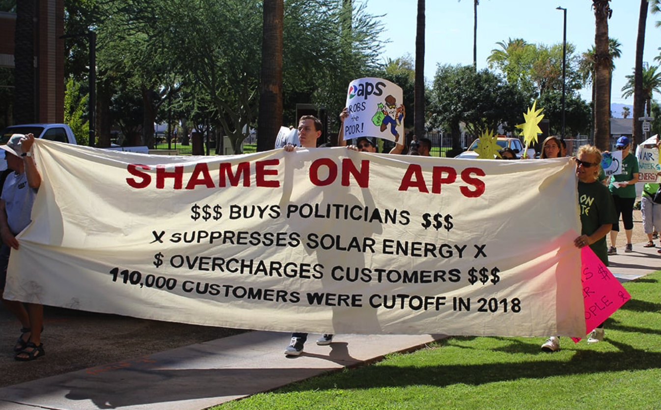 Protesters march around the Arizona Corporation Commission building in Phoenix before a September 2019 meeting about Arizona Public Service’s electricity shut-off policy. ||File photo by Jake Eldridge/Cronkite News)