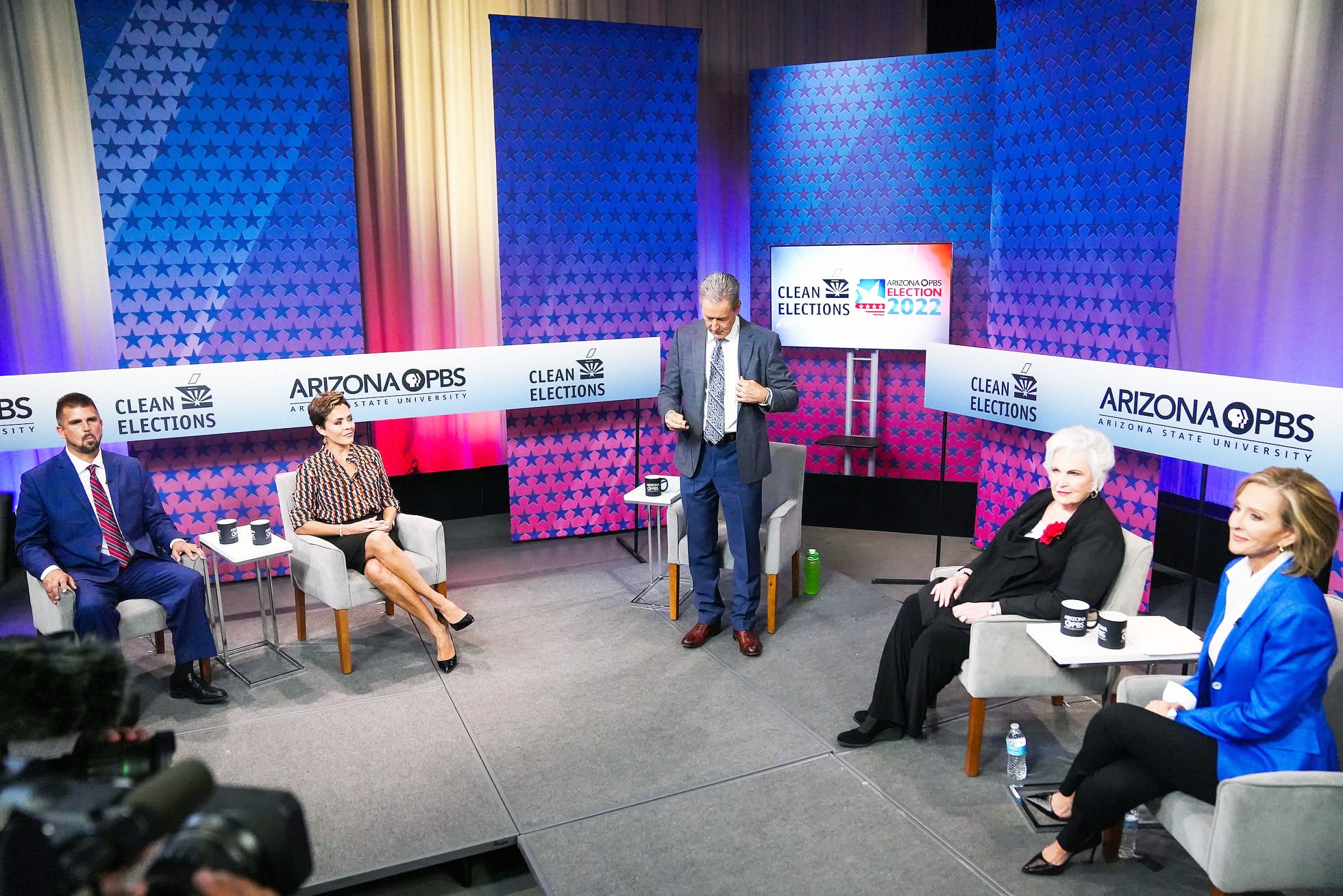 (From left) Scott Neely, Kari Lake, Ted Simons, Paola Tulliani Zen and Karrin Taylor Robson prepare before a debate with Republican candidates ahead of the Aug. 2, 2022, primary election for the Arizona governor’s office in Phoenix. || KAET TV 8