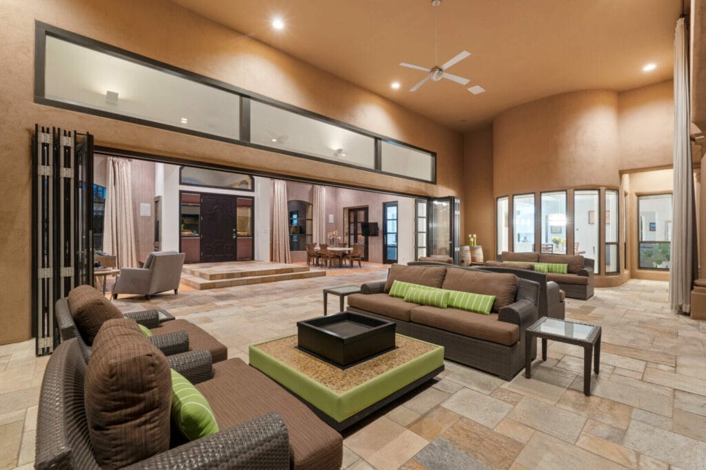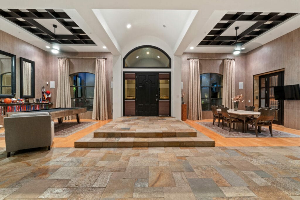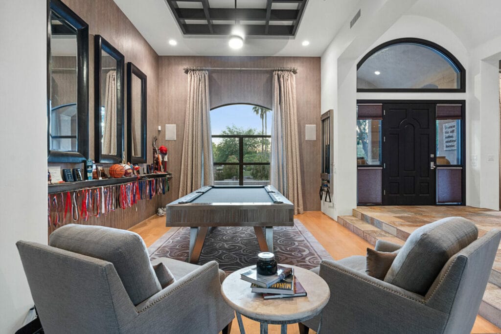 The oversized three-car garage home has multiple updated amenities. Features include a dramatic entry to the split-floor plan home that boasts a private office and gym. The tranquil owner’s suite has a bar, floating cabinets, modern finishes and stone surrounds, giving the space a high-end spa look and feel. A modern kitchen includes high gloss cabinets, stainless steel appliances, a butler’s pantry, beverage fridge and plenty of storage. An additional bedroom wing includes three guest rooms and three bathrooms with its own private living space, a video gaming area and a bar with additional fridge drawers. The main living room has large pocket doors, exquisite for entertaining, that open to a captivating backyard that includes a pool, spa, expansive patio, impressive sports/basketball court and putting green. Impeccable touches to note are the walk-in wine cellar and a one-bedroom casita with a bathroom.