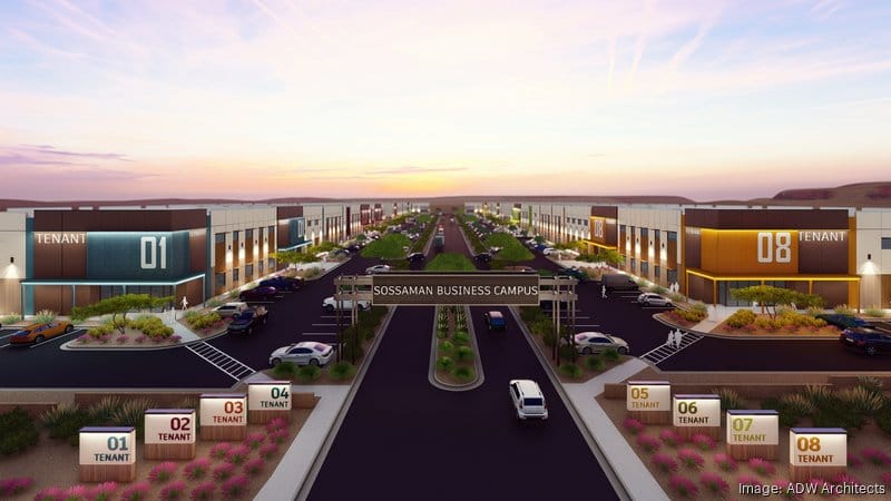 A conceptual rendering of the eight-building, 330,000-square-foot Sossaman Business Campus in southeast Mesa. Via ADW Architects