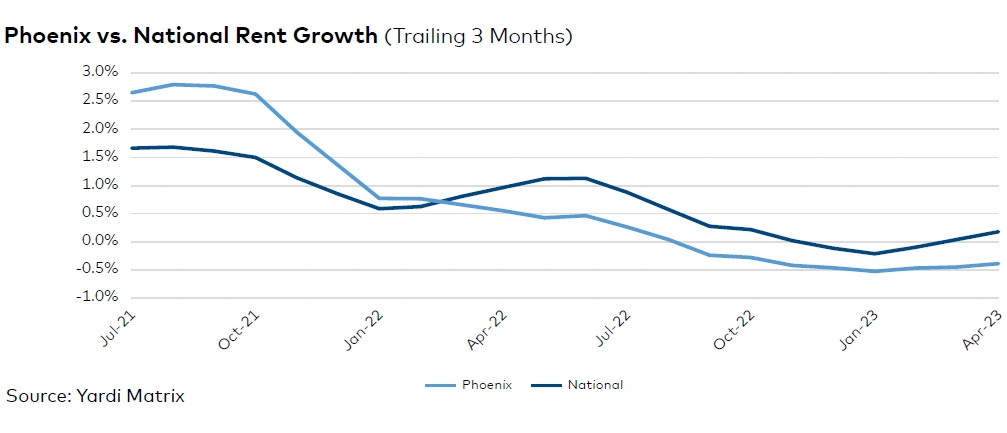 Phoenix’s robust stock expansion continues to impact rates and occupancy. The average rate posted the weakest performance among major U.S. markets, down 2.8 percent year-over-year through April, to $1,608. Meanwhile, the national figure decelerated to 3.2 percent, reaching $1,709. Occupancy slid 130 basis points in the 12 months ending in March, to 94.0 percent, with a larger decline in the Renter-by-Necessity segment.