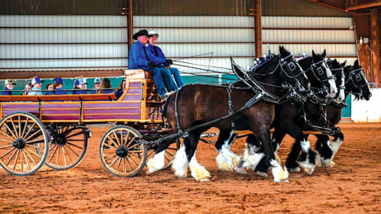 A draft horse team pulls its “rig” through one of the covered arenas at Horseshoe Park and Equestrian Center. (4D, Brian Dygert/Submitted)
