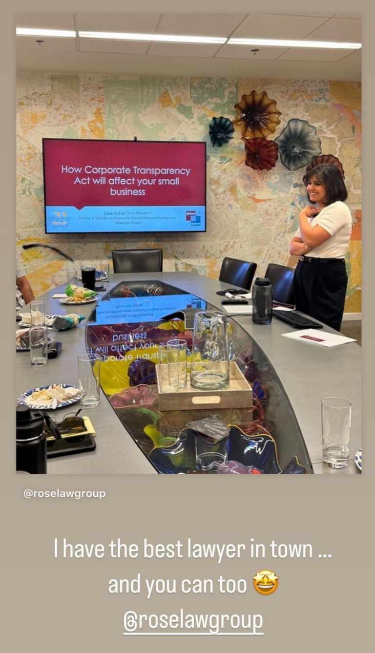 Corporate Transparency Act presentation by Shruti Gurudanti, Rose Law Group partner & director of corporate transactions, receives client shoutout!