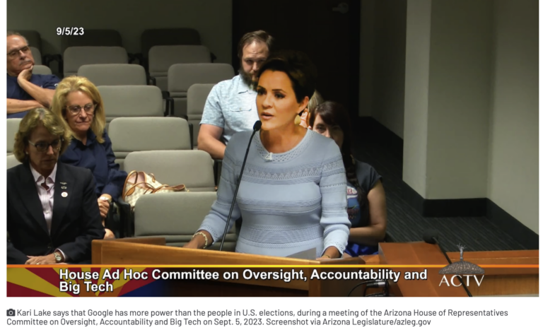 One anti-Google researcher declared the tech giant cost Kari Lake an election win in 2022 CAITLIN SIEVERS Arizona Mirror Kari Lake told the small crowd