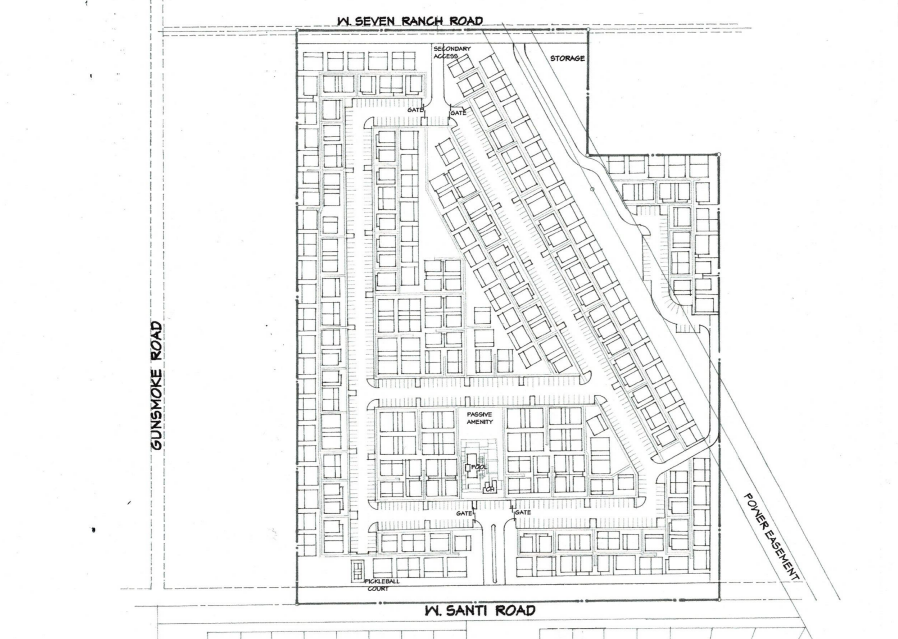 A conceptual site plan shows 339 units in a compact neighborhood with a communal pool, clubhouse and pickleball court. The neighborhood would be accessed by Seven Ranch and Santi Roads.