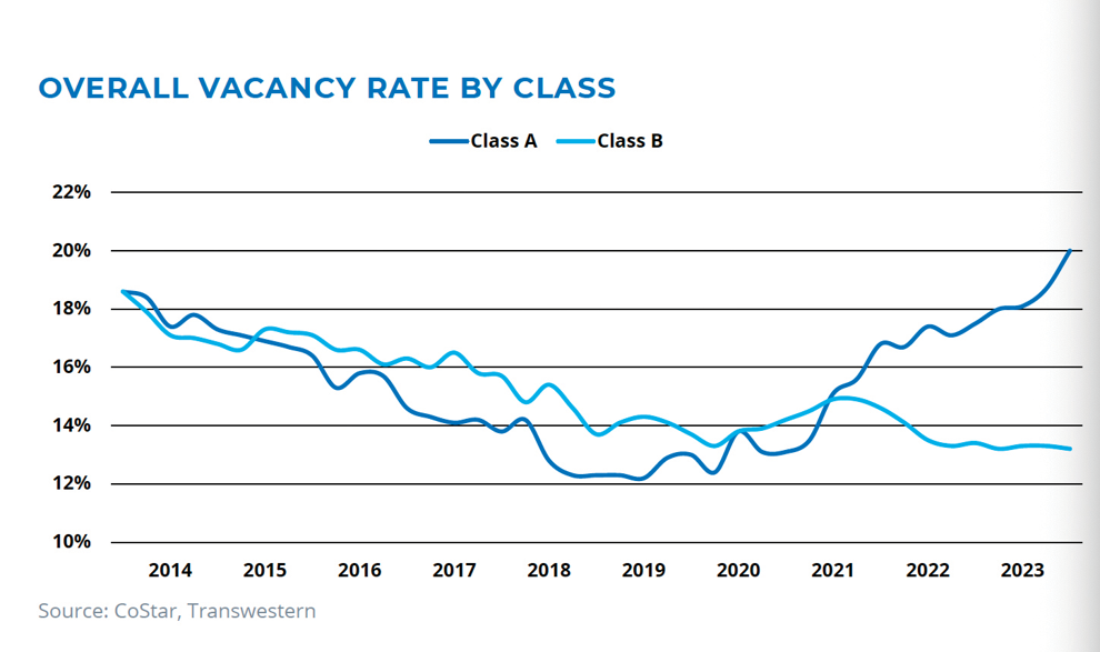 “Buyers and sellers continue to be at odds on pricing, with neither side wanting to make concessions to get deals over the finish line,” Transwestern said. “With tighter lending and unfriendly interest rates, investment activity continued to be incredibly stifled in Q3.”
