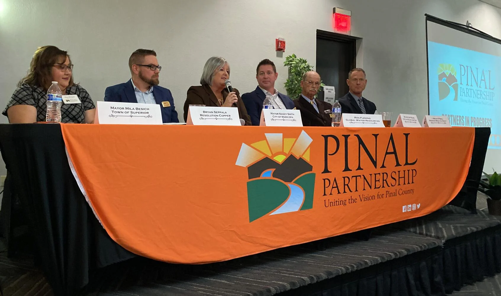 The Pinal Partnership forum lineup was Superior Mayor Mila Besich, from left, Bryan Seppala, principal adviser for Resolution Copper; Maricopa Mayor Nancy Smith, Ron Fleming, president and CEO of Global Water Resources; Apache Junction Mayor Chip Wilson; and J. Brian O’Neill, executive director of the Phoenix-Mesa Gateway Airport Authority. Courtesy of Pinal Central