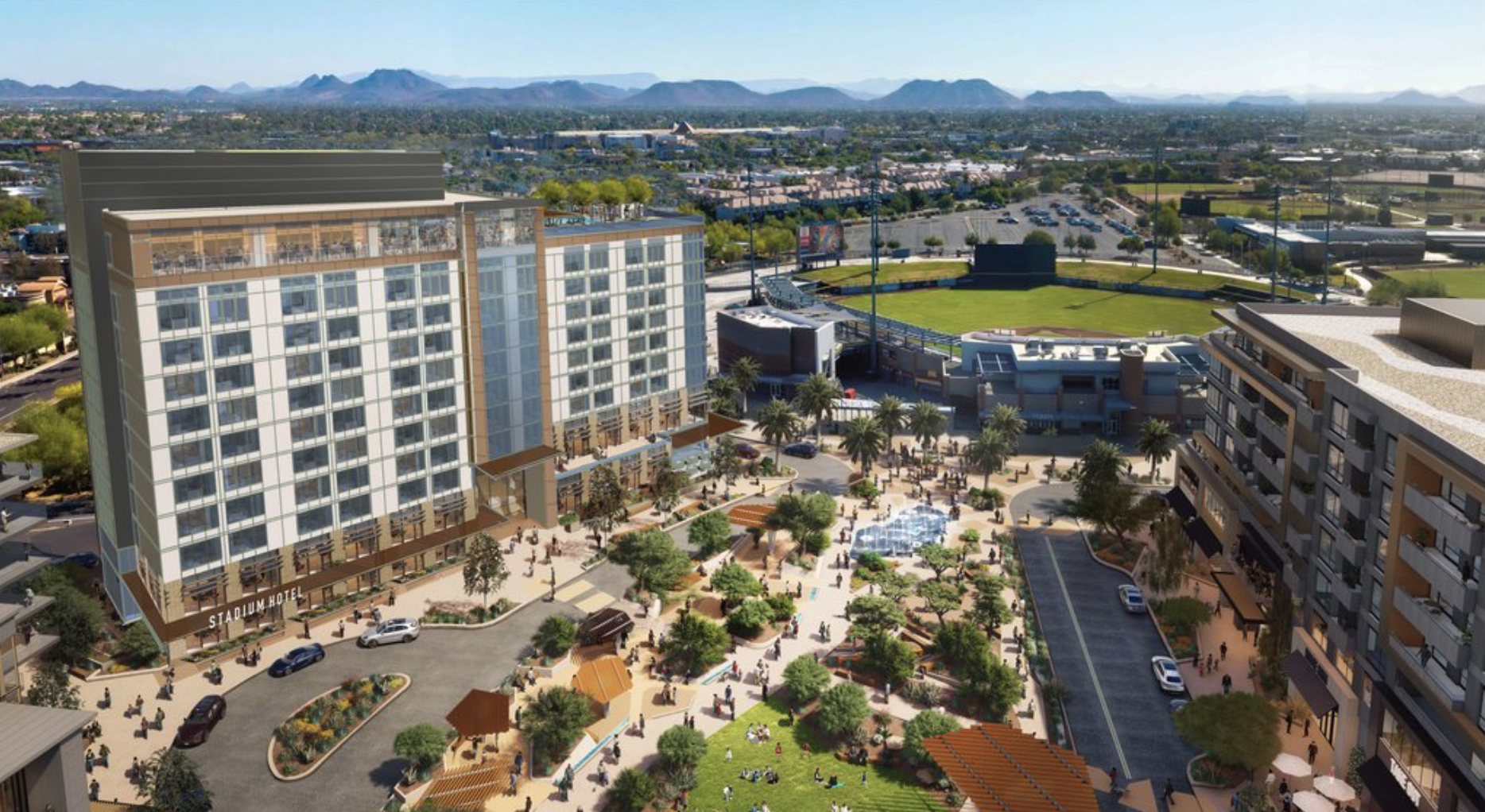 The proposed Stadium Point mixed-use development in Peoria is slated to break ground by the summer of 2024. Rendering via Steinhauer Properties.