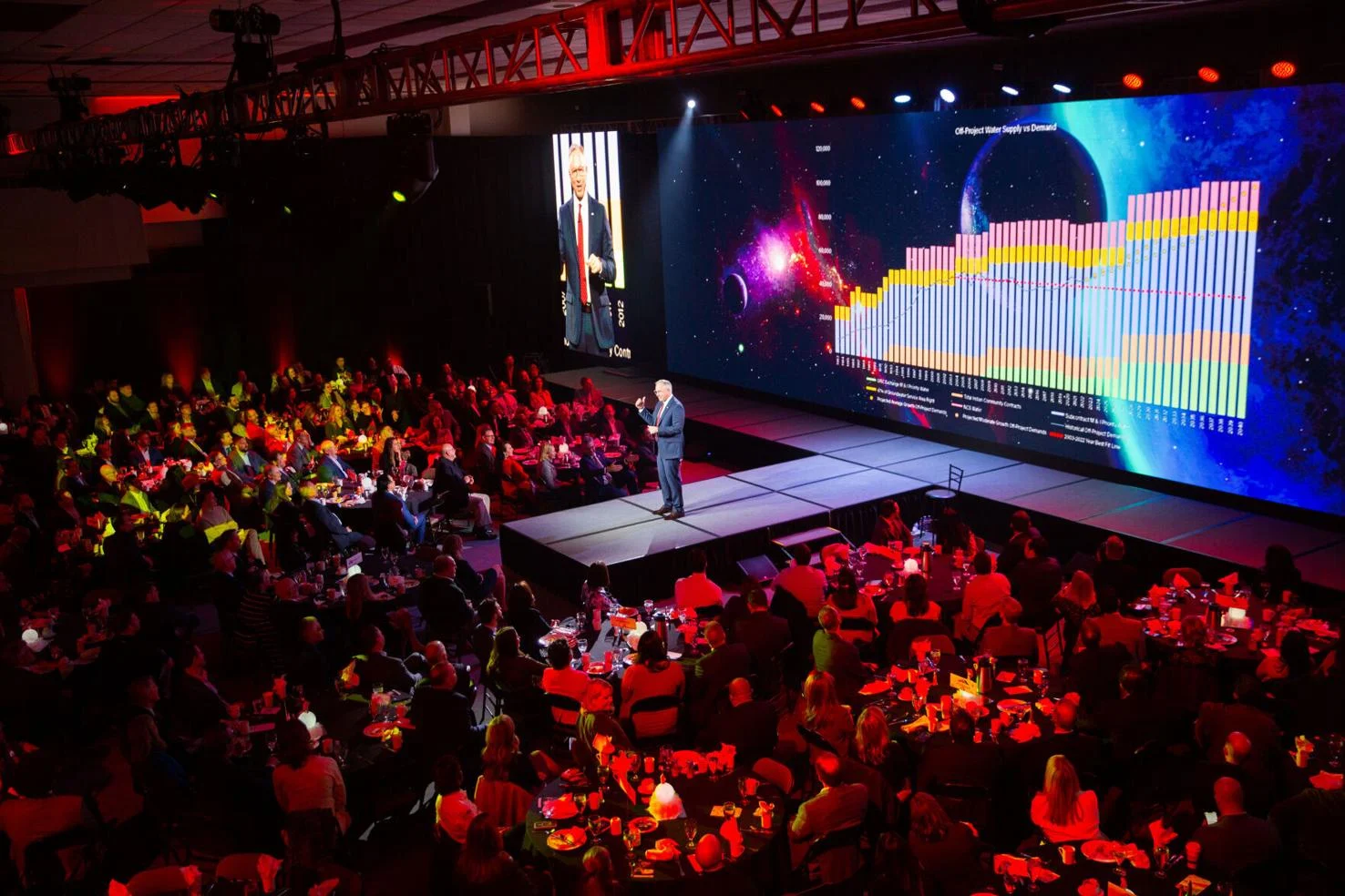 Hosted by the Mesa Chamber of Commerce at the Mesa Convention Center, the speech featured pre-recorded appearances from rocker Alice Cooper, U.S. Sen. Mark Kelly and Arizona State University President Michael Crow.