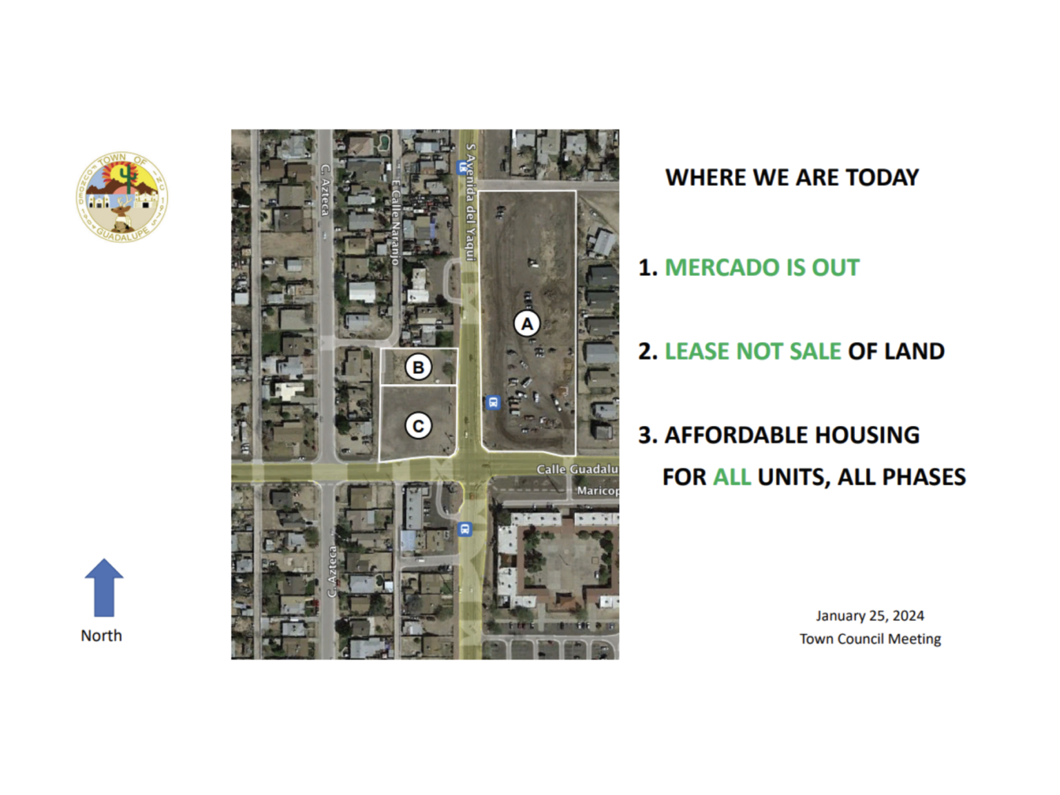 The public request for proposals process was Guadalupe’s third attempt to develop the site. The first two garnered no responses. The Richman Group was one of three proposals that were originally due in December 2022. In March 2023, Town Council unanimously agreed to negotiate a development agreement for the Town Commons project.