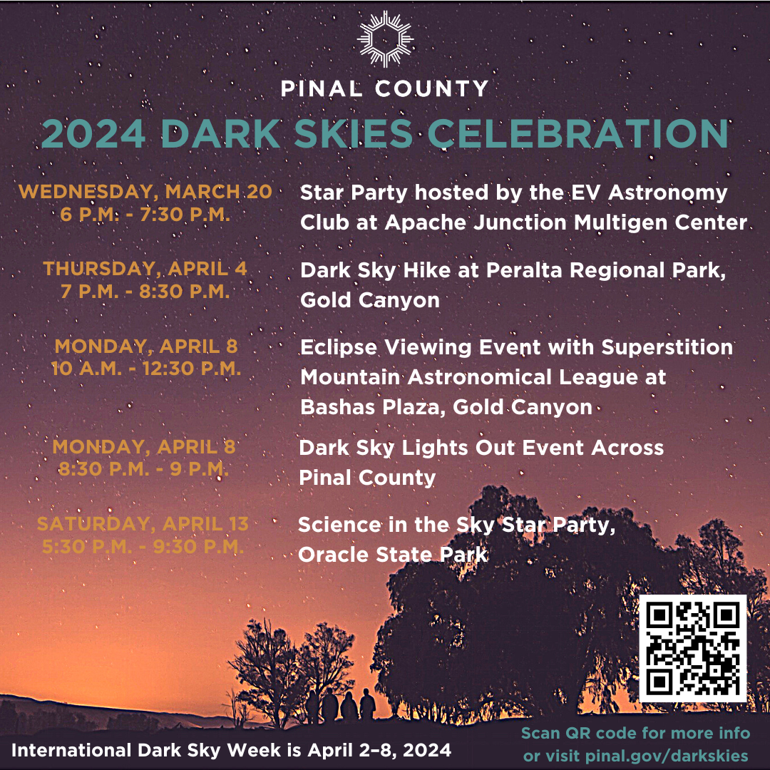 On Monday, April 8th, for thirty minutes from 8:30 p.m. to 9 p.m., we encourage Pinal County residents to join us in observing a thirty-minute ‘Dark Skies Lights Out’ Event across Pinal County, turning off all unnecessary lighting indoors and outdoors at home to reduce light pollution, step outside and look up, and enjoy the beauty of the night sky and the wonders of our universe!