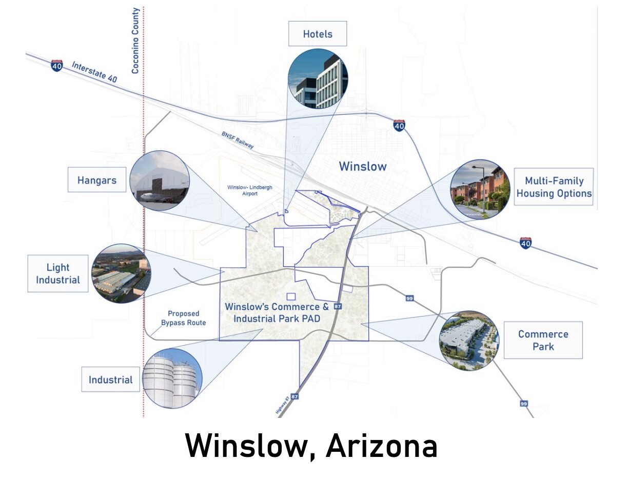 After more than a year of public discourse and anticipation, the first official submission of the Winslow Commerce and Industrial Park Planned Area Development (PAD) has finally been made to the city. This extensive proposal, crafted by Atlas Global Development Group LLC, outlines the future transformation of approximately 1,618 acres into a vibrant industrial and commercial hub. The plan aims to leverage Winslow’s strategic location, including proximity to major transport routes and the Winslow-Lindbergh Regional Airport, to attract significant business opportunities and economic growth. This recent submission marks a crucial step forward in the realization of a multi-billion-dollar project that promises to reshape the economic landscape of Winslow. This initial submission is to receive comments and to make drafts and is unlikely to be presented or passed by city council in its current form.