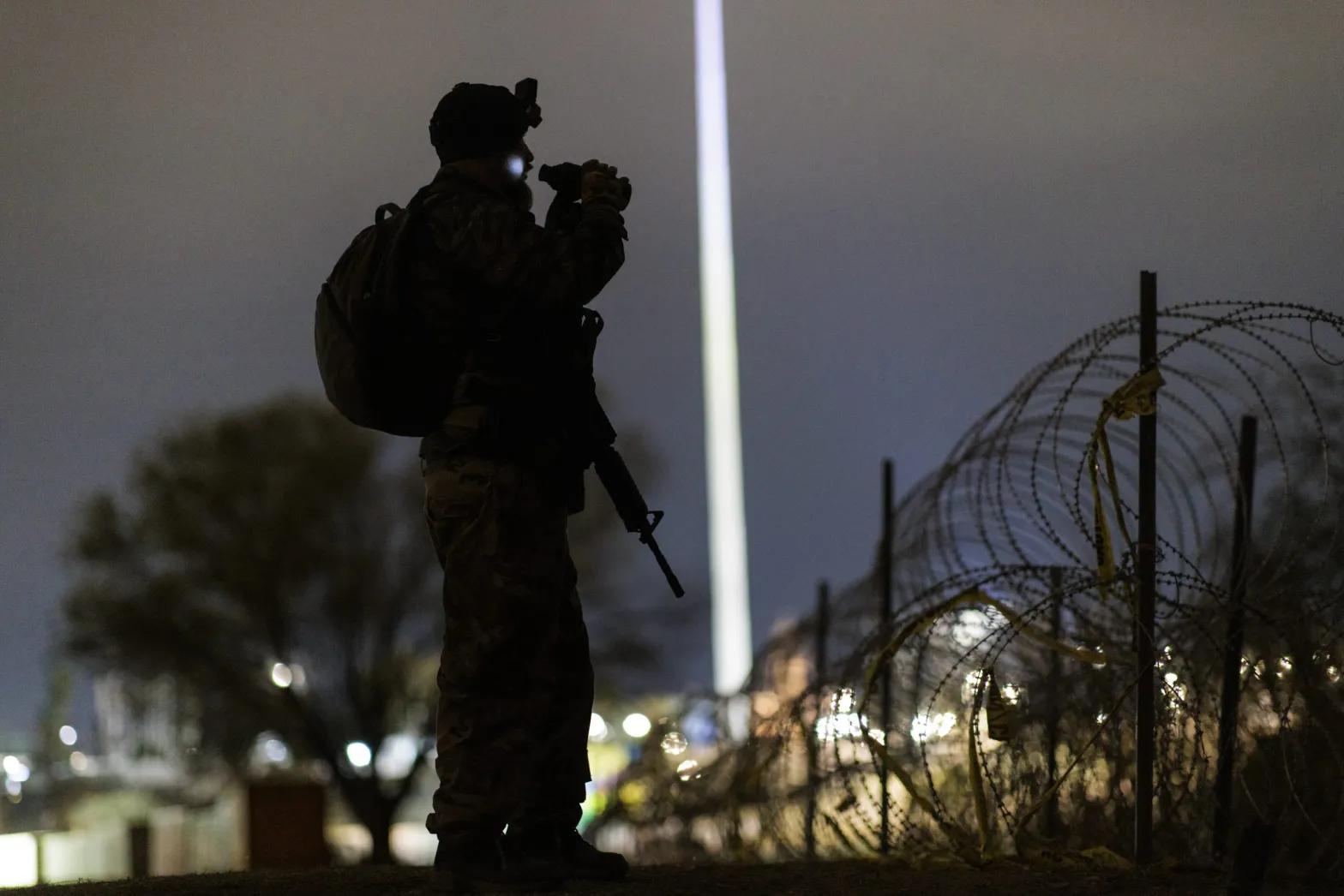 A member of the Patriots for America vigilante group looks through night vision goggles in Shelby Park in Eagle Pass, Texas, in 2022. Photo by Jordan Vonderhaar for Arizona Center for Investigative Reporting