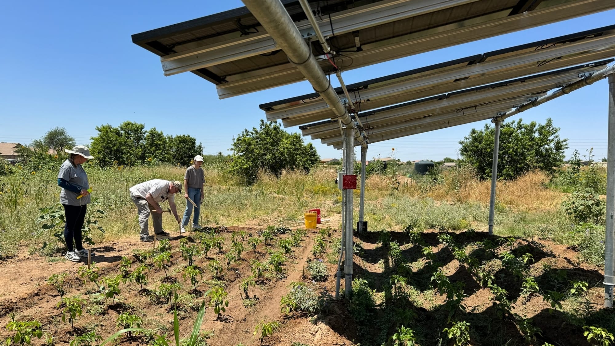 Rows of crops grow under solar panels while farmers work on the side of Spaces of Opportunity’s agrivoltaic plot in Phoenix. Photo courtesy of Sarah Bendok