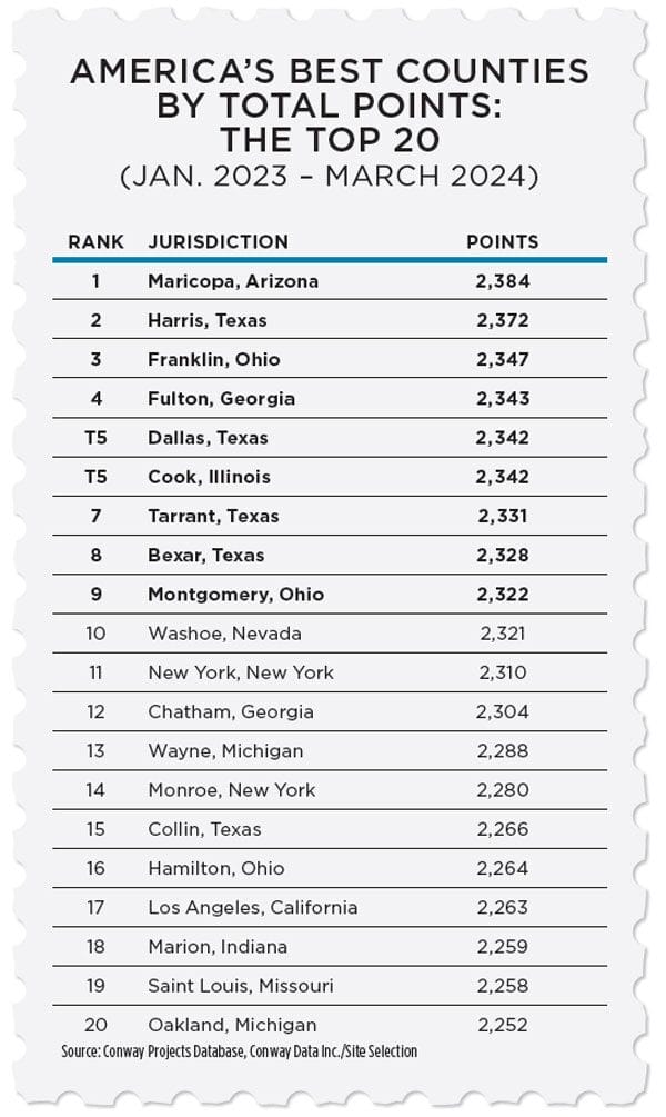 These rankings are based on total points awarded to counties based on number of projects between January 2023 and March 2024, capital investment and jobs created according to project data resident in Site Selection’s Conway Projects Database.