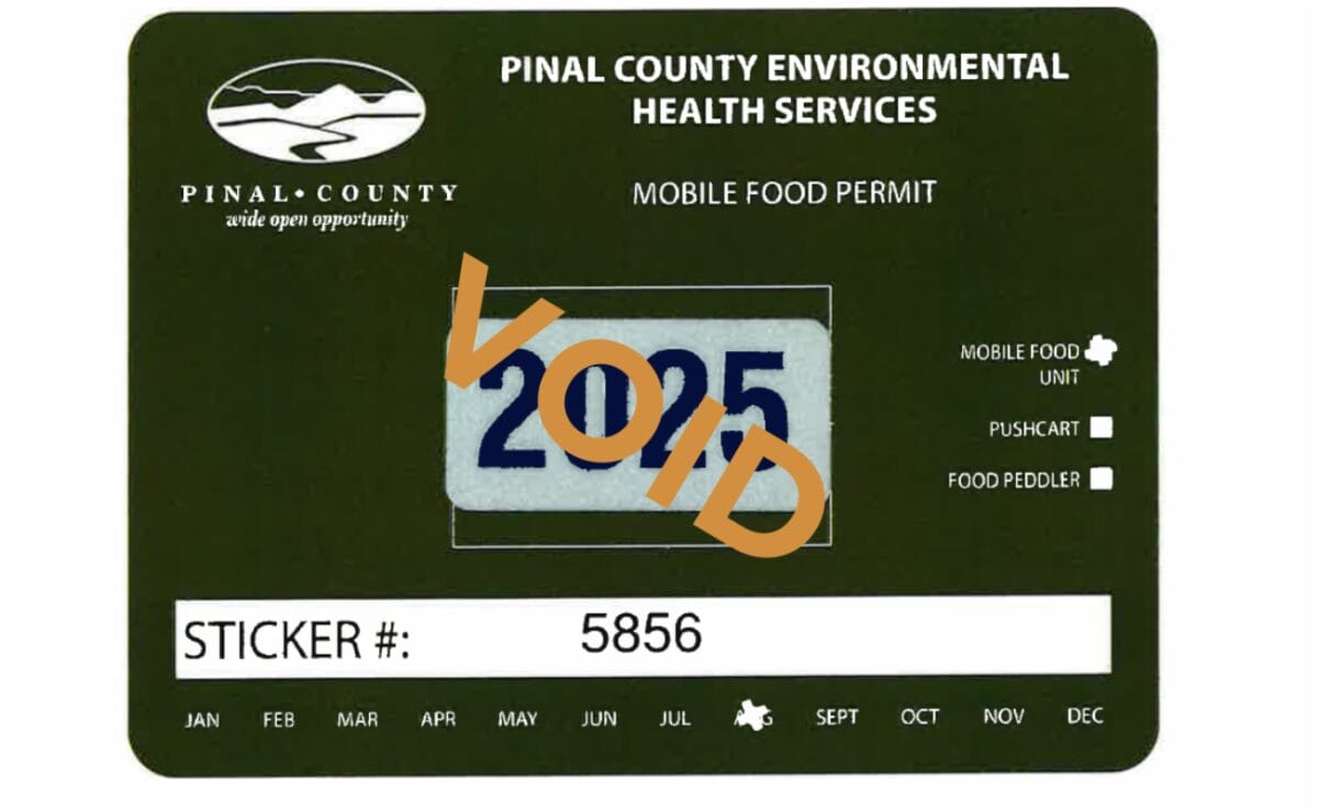 Mobile vendors that have gone through the permitting process and have been approved by Pinal County Environmental Health must display a sticker, as shown below. Food vendors not displaying these stickers are prohibited from operating in Pinal County.