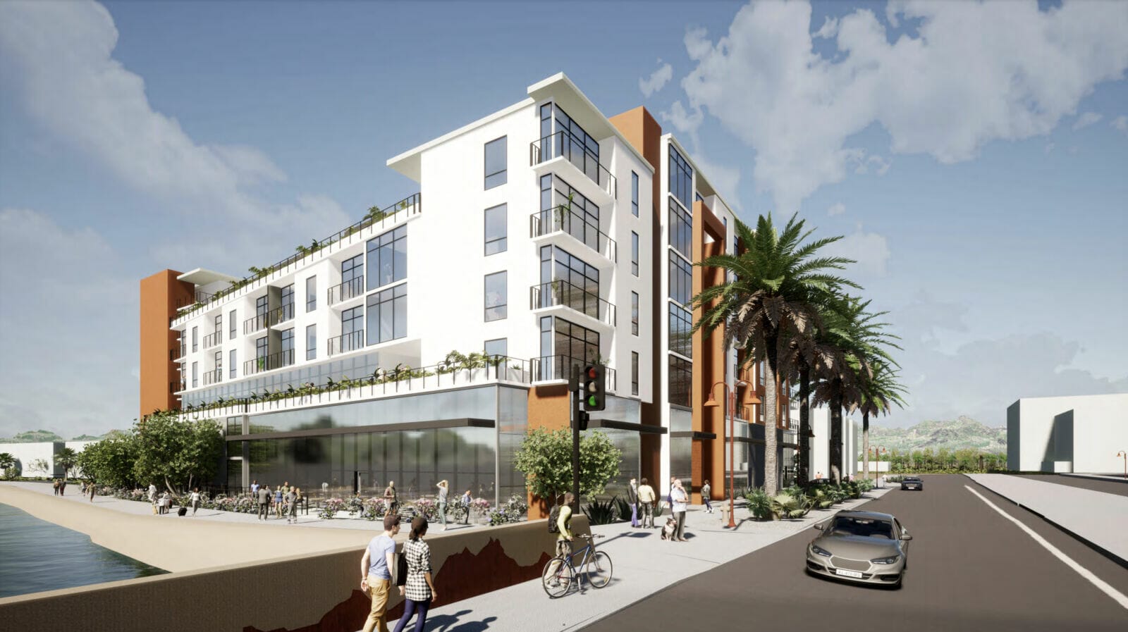 Plans for Forty600 call for a seven-floor apartment complex with 155 units and a ground floor, with commercial space including a restaurant with exterior seating facing the Grand Canal and shaded sidewalks. (Rendering courtesy of RAS Development)