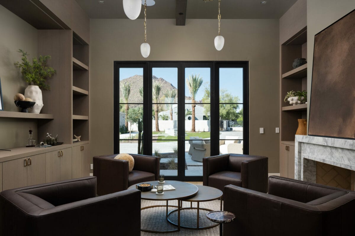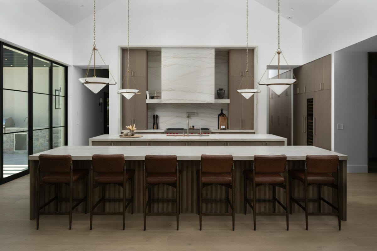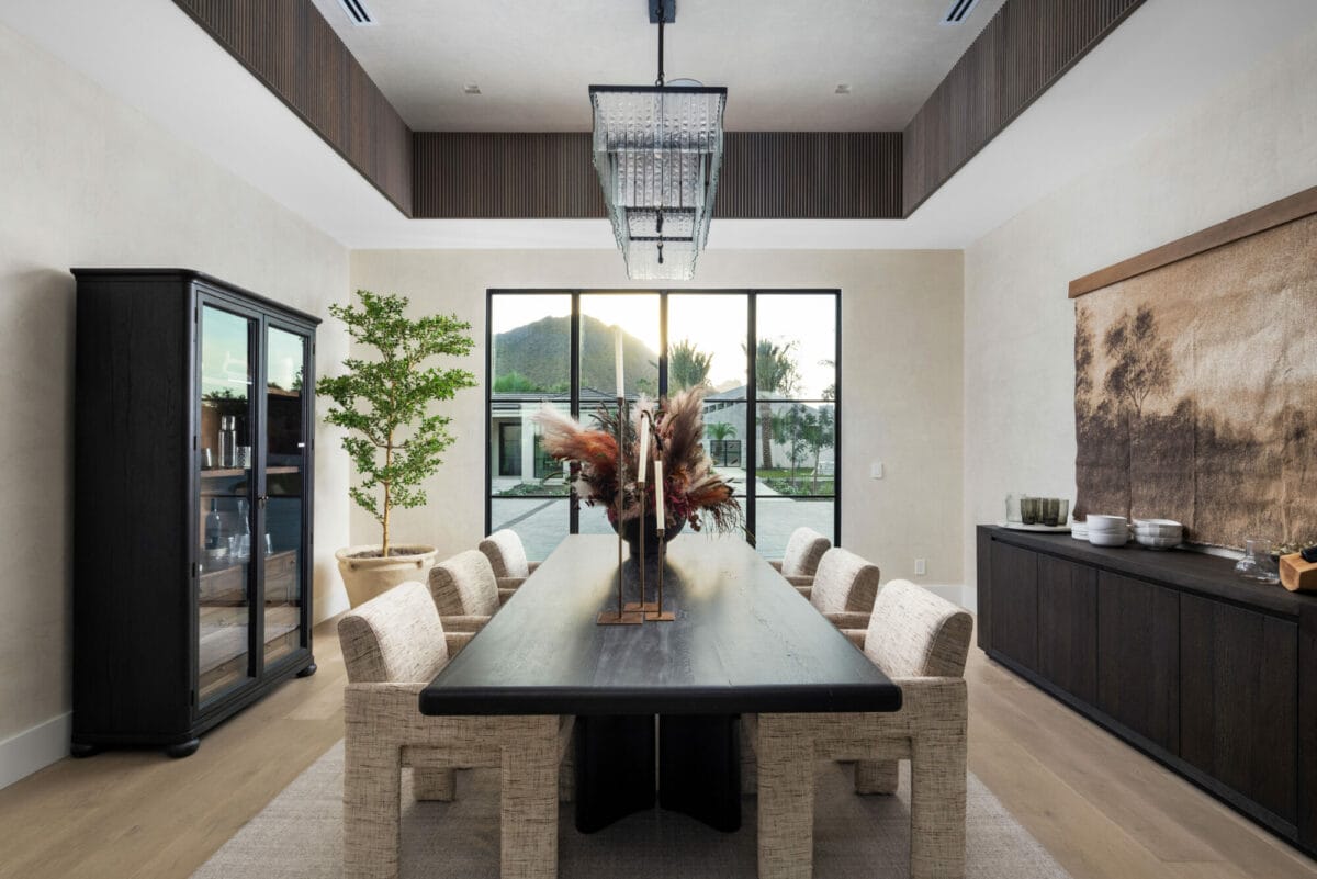 The main residence features five bedrooms, five-and-a-half bathrooms and a five-car, air-conditioned garage equipped with EV charging, complemented by a two-bedroom, two-bathroom detached casita. Design firm Grey Collective curated the estate with warm interiors, using natural and organic textures of fabrics and architectural elements to highlight each aspect of the design. The kitchen features large double islands and is outfitted with Wolf and SubZero appliances, a built-in Wolf coffee maker and an ice machine. A unique piece in the design is the wine display, customized from rift white oak with custom leather handles to harmonize the kitchen and dining room. A well-appointed back kitchen enhances functionality and privacy, providing a streamlined flow from the garage to the main kitchen. Grey Collective combined the simplicity of slab cabinetry doors with reeded wood panels on the island and the dining room ceiling cove, exemplifying transitional interior design.