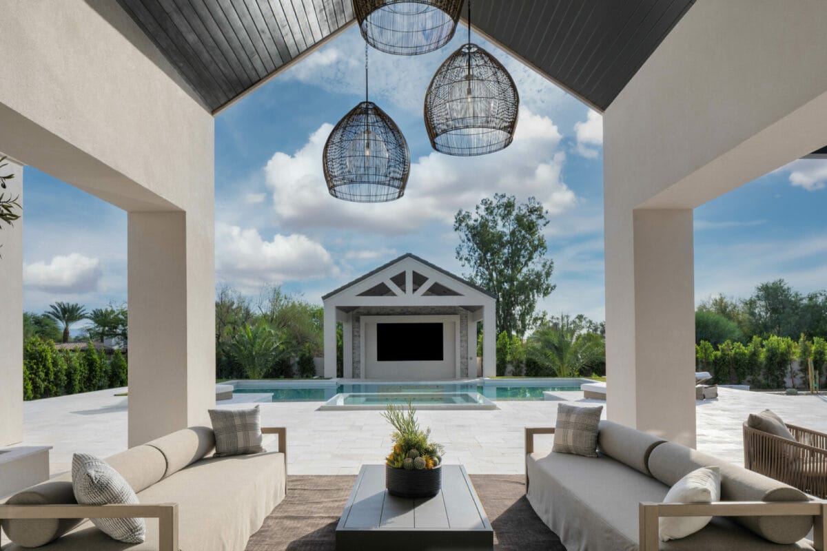 The property’s highlight, however, might just be its resort-inspired backyard. Grand living areas open to expansive covered patios, a full outdoor kitchen, and a lavish heated pool. An LED video wall under a large cabana offers an unparalleled outdoor cinema experience, where guests can relax around the gas firepit in the pool cabana, from the heated spa, or within the great room inside. A sunken bocce ball and pickleball court complete this entertainer’s dream backyard.