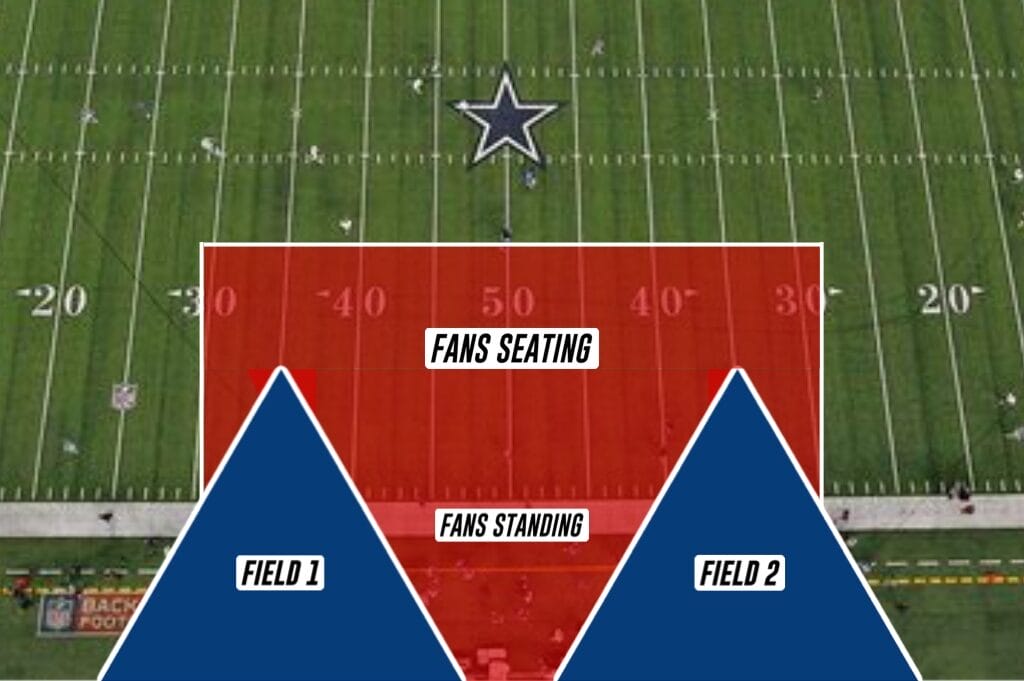 Two fields will be set up near the 50 yard line of the stadium. 150 seats will be set up behind the fields. There will also be standing room in between and on the sides of each field (see full field layout map below). A cooler will be available with water but no other outside food or beverages will be allowed into the event.