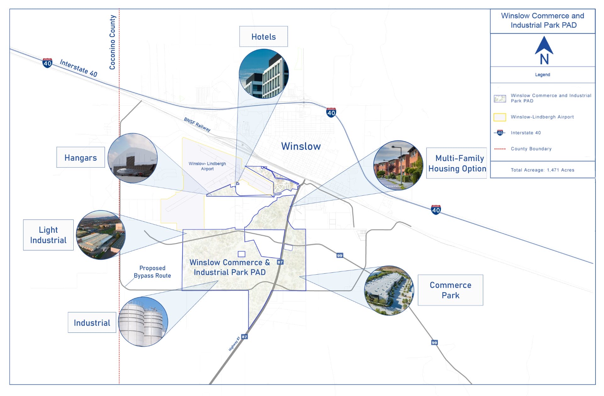 At last week’s Winslow City Council meeting, a major step forward was taken in the development of the Winslow Commerce and Industrial Park, a 1,479-acre project located in southern Winslow led by Atlas Global Development. The council approved a rezoning request to designate the area as a preliminary Planned Area Development, or PAD, and finalized a development agreement to guide the project. The development agreement is essentially an extra set of rules put on a developer so that the city will be cooperative in developments that have a large impact on their communities. Although this is an important step in the process, ultimately the council will still need a final PAD with several bouts of additional information before a shovel ever hits that red dirt.