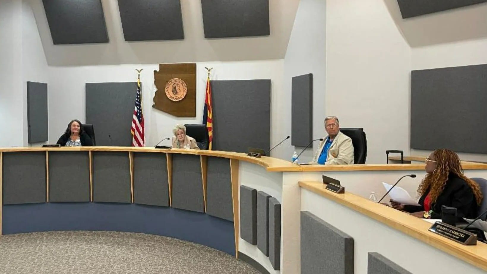 Cochise County supervisors Peggy Judd, Ann English, and Tom Crosby listen to county officials at a recent board meeting. Photo courtesy of Cochise County