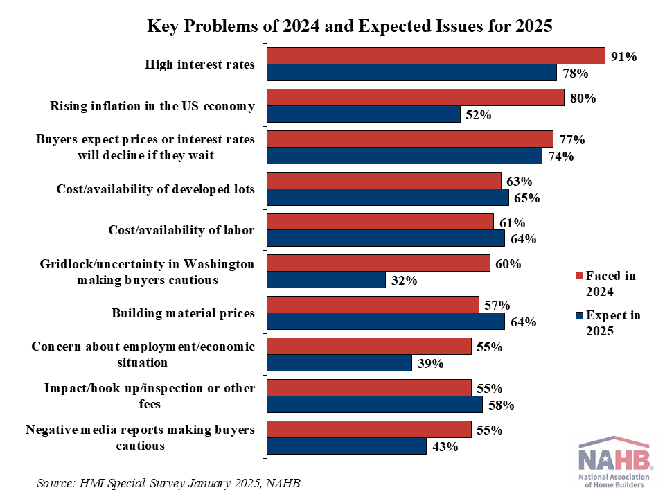 The most significant challenge builders faced in 2024 was high interest rates, as reported by 91% of builders in the latest NAHB/Wells Fargo Housing Market Index survey. A smaller, albeit still significant share of 78% expect interest rates to remain a problem in 2025. The next four most serious issues builders faced in 2024 were rising inflation in the U.S. economy (80%), buyers expecting prices/interest rates to decline (77%), the cost/availability of developed lots(63%), and the cost/availability of labor (61%). Builders don’t expect much improvement in these challenges in 2025, except for rising inflation, which ‘only’ 52% see as a serious problem in the year ahead.