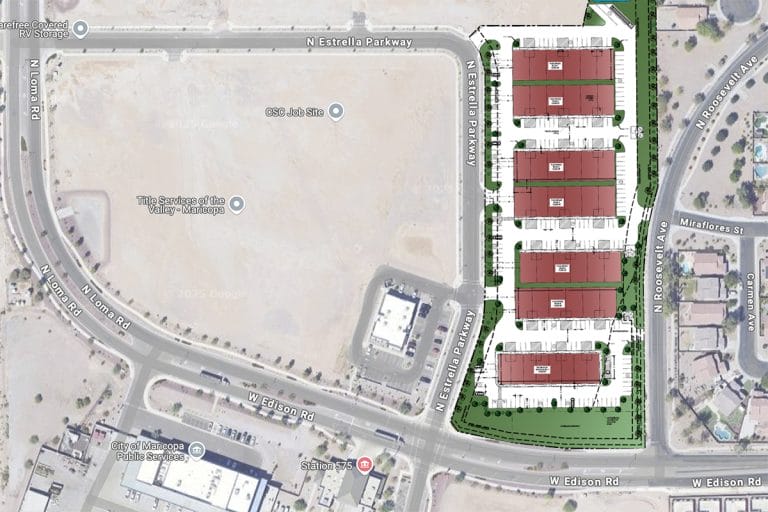 A landscape plan of a flex business space is layered over a satellite image of the Estrella Gina Business Park area. [City of Maricopa, Google]