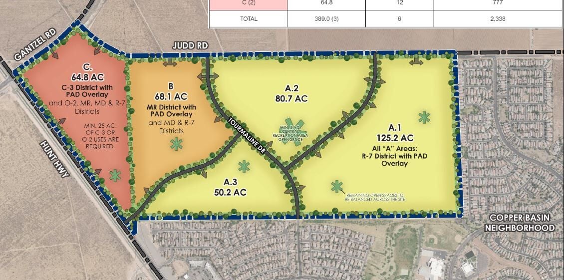 Approximately 389 acres of state land at East Hunt Highway and North Gantzel Road in San Tan Valley will be developed for a housing and retail area called North Copper Basin, following the approval of the Pinal County Board of Supervisors.