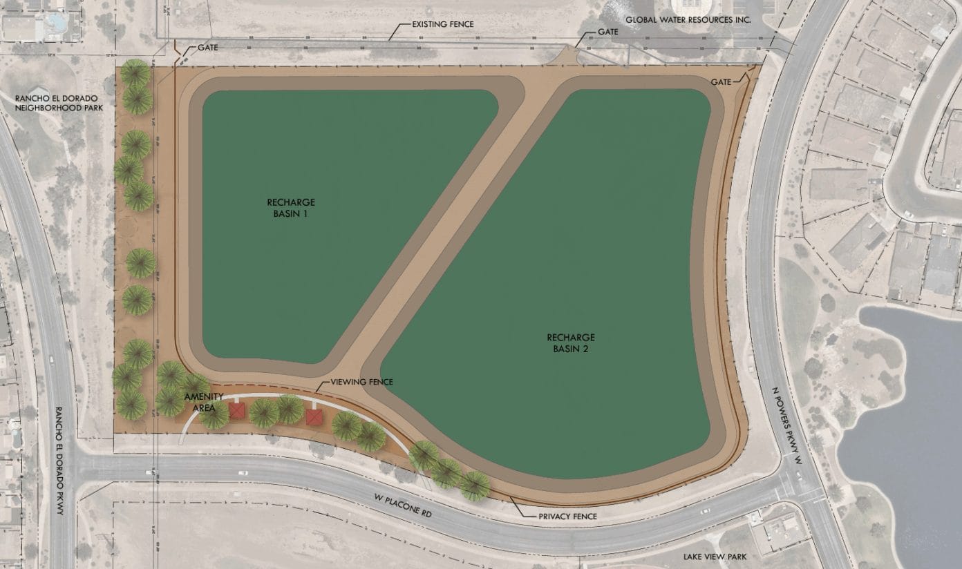 The Maricopa Aquifer Recharge Facility would sit on the north end of the city on Powers Parkway near Lake View Park in the Rancho El Dorado neighborhood. Early plans submitted in August outline two percolation basins with the option for a third, a viewing fence and a small amenity area with educational signage explaining how recharge works.