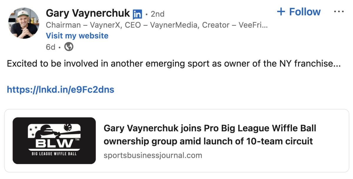 Entrepreneur and internet personality Gary Vaynerchuk and his brother AJ headline the ownership group with their N.Y. Green Apples franchise, joining Marc Lasry (Las Vegas Scorpions), David Adelman and Ron Biscardi (Philadelphia Wiffle Club), Dude Perfect (Dallas Pandas) and others. The Green Apples name nods to N.Y.’s “Big Apple” moniker and Vaynerchuk’s lifelong Jets fandom.