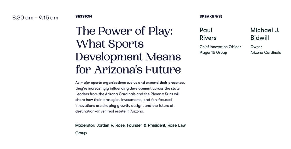 JORDAN ROSE (Founder & President, Rose Law Group) moderating The Power of Play: What Sports Development Means for Arizona’s Future