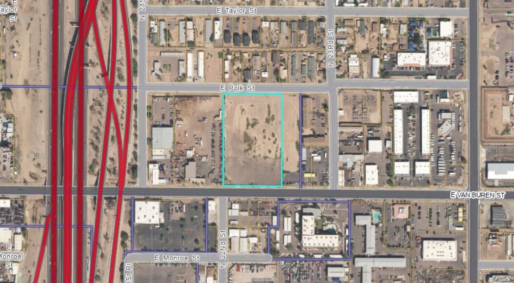The property is about half a mile north of Phoenix Sky Harbor, however, it is just outside of noise contour lines that restrict certain land uses, like residential. The noise contour lines extend much further to the east and west of the airport in the direction planes are taking off and landing, but they don’t extend nearly as far north and south.
