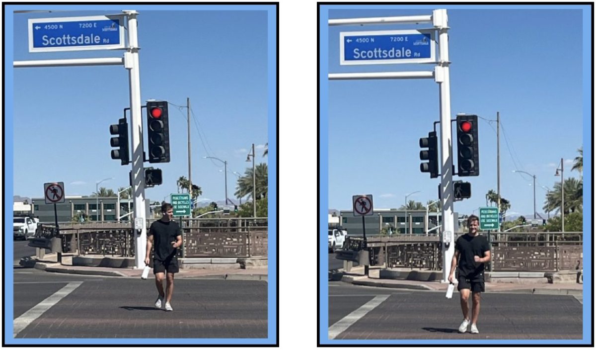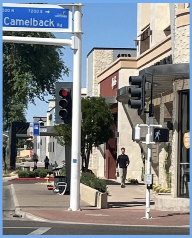 In my first professional traffic engineering journal article, published 41 years ago, I mentioned that our profession was obligated to consider both the probability and severity of error. It is quite rare for a vehicle to hit a pedestrian. However, it is usually a life-altering event for the person who was walking, and not in a good way. The person below was very attentive to oncoming vehicles. Notice how far into the intersection he was with the walk symbol and the red circle simultaneously visible. Hopefully, he also viewed Camelback Road traffic that might have been turning left or right, as he crossed the street.