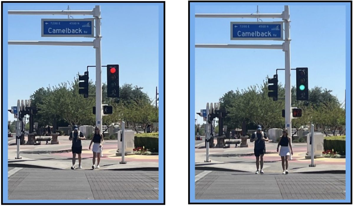 The previous Scottsdale Traffic Engineer (not me) many years ago received a call from a resident or tourist concerned about pedestrians at the Scottsdale / Camelback intersection. This traffic engineer visited the intersection several times, plus observed it by camera many more times. He noticed that many drivers stared at the traffic signal ready to leave the instant the green light appeared, everyone else be damned. He had heard of starting the walk signal first at other locations in the country, and thought it might be of benefit at this location.