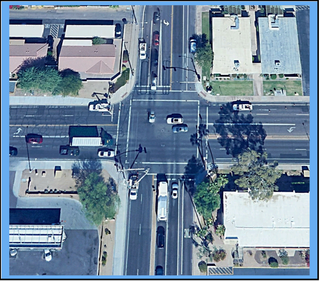 Signals know when vehicles are present through one of two devices, a wire or a camera. The process utilized for decades in greater Phoenix has been a wire embedded in the pavement. The aerial photograph below indicates the wire rectangle, with a close-up inset in a purple rectangle.