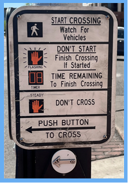 Oh, if the button is there, you need to push it (firmly, gently, only once), if you would like to cross the street safely with a walk signal and a countdown clock or flashing don’t walk signal. Otherwise, if a pedestrian push button is present and you do not push it, the walk symbol will typically not automatically appear.