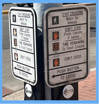 Sometimes, there are pedestrian push buttons for each street. The arrow at the bottom of the sign points in the walking direction. Please only push the button for the direction(s) you wish to travel. Otherwise, the walk signal appears and vehicles have to wait for phantom pedestrians, causing unnecessary congestion.