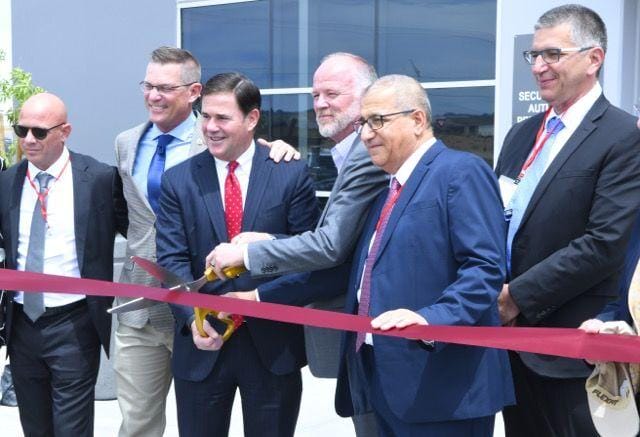 Gov. Doug Ducey, third from left, helps cut a ribbon Wednesday for the formal opening of the new U.S. headquarters of CP Technologies in Prescott.