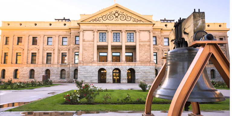 An old watchtower bell is mounted on the sidewalk in front of the state capitol building/Arizona Capitol Times By Julia Shumway | Arizona Capitol Times
