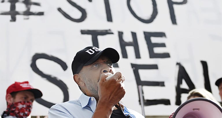 In this Saturday, Nov. 7, 2020 file photo, President Donald Trump supporters cheer as Georgia State Rep. Vernon Jones speaks, at the capital, in Atlanta.
