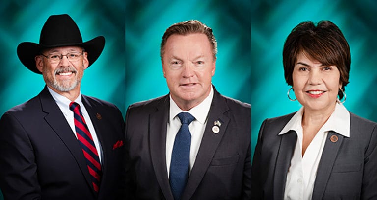 From left are Rep. Mark Finchem, R-Oro Valley, former Rep. Anthony Kern, and Rep. Charlen Fernandez, D-Yuma By Nathan Brown | Arizona Capitol Times A