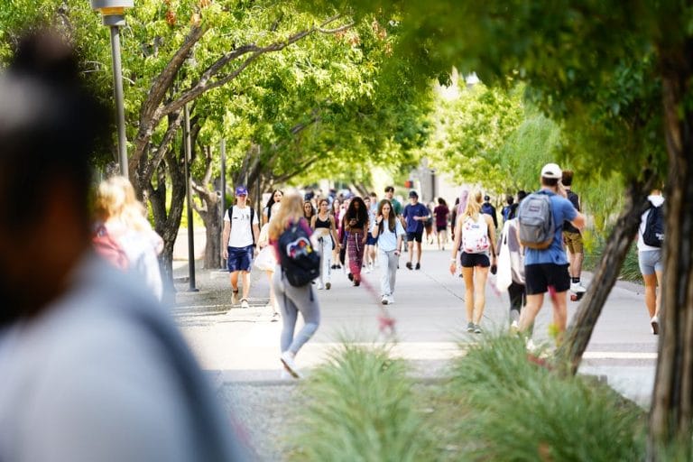 Students walk down East Lemon Mall outside the Sun Devil Fitness Complex on the ASU Tempe campus on Monday, Sept. 27, 2021. Alex Goul Some