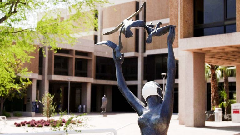 A sculpture outside of the University of Arizona’s Main Library is donned with a face mask. /AZPM Staff University testing shows a COVID positivity rate of