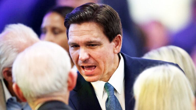 Florida Gov. Ron DeSantis greets guests at the Republican Party of Marathon County Lincoln Day Dinner annual fundraiser on May 6, 2023, in Rothschild, Wisconsin.