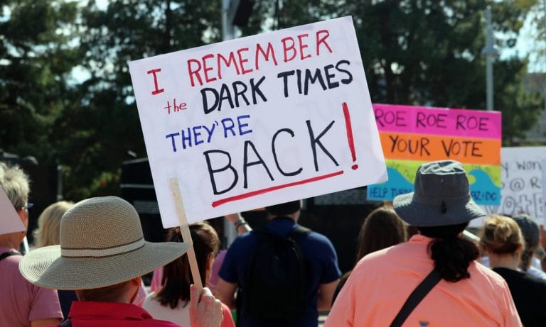 Abortion supporters hold up signs condemning recent abortion restrictions and calling for the election of pro-choice candidates at a rally in Phoenix on Oct. 8,