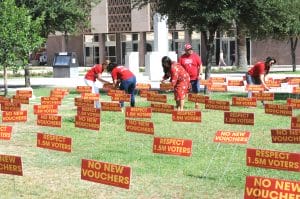 Members of Save Our Schools Arizona erect signs on the lawn at the Capitol Wednesday urging lawmakers to reject universal vouchers and honor the will
