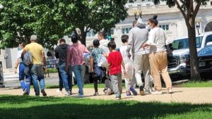 An aid worker leads a group of migrants into Washington’s Union Station to get food after they were dropped off by a bus that brought
