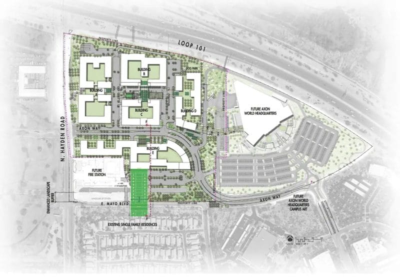 The now canceled plan for a new Axon headquarters was proposed at Hayden and the Loop 101. Rendering via City of Scottsdale. By Jamar Younger