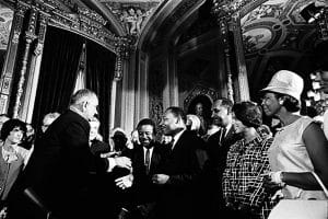 President Johnson, Martin Luther King, Jr., and Rosa Parks at the signing of the Voting Rights Act on August 6, 1965. Democracy is a relatively